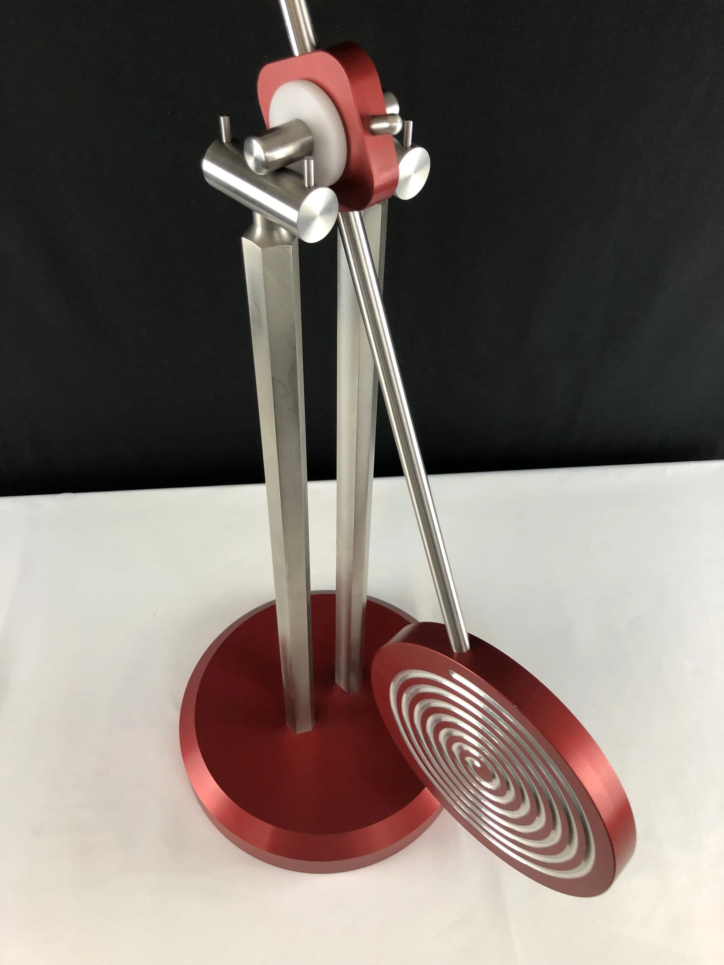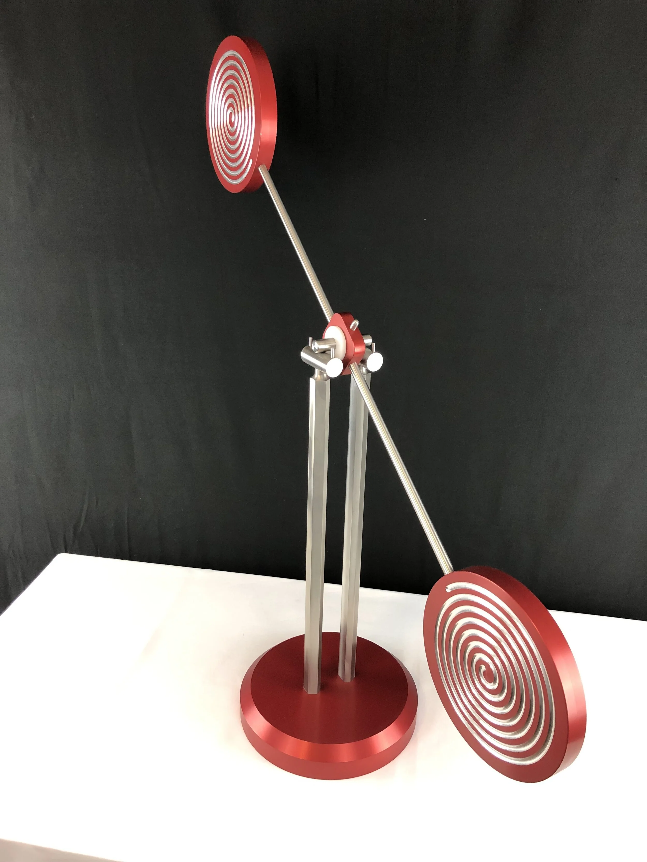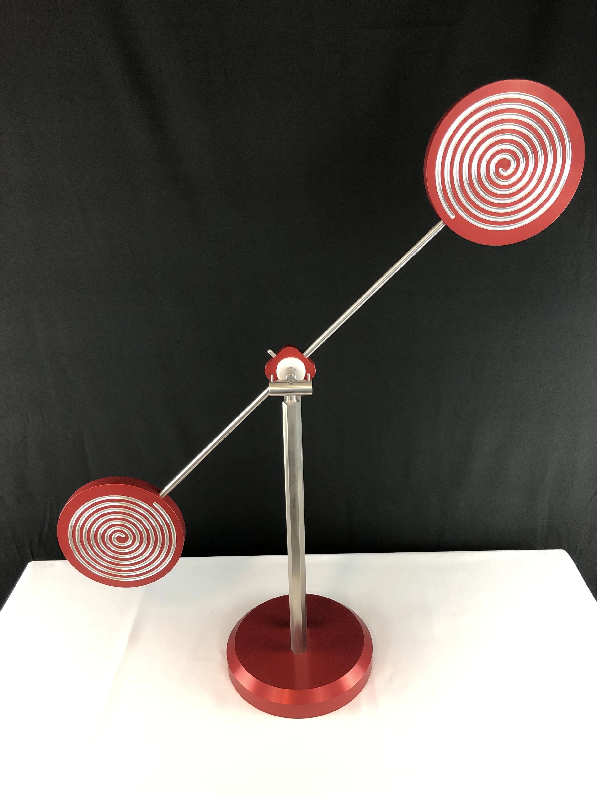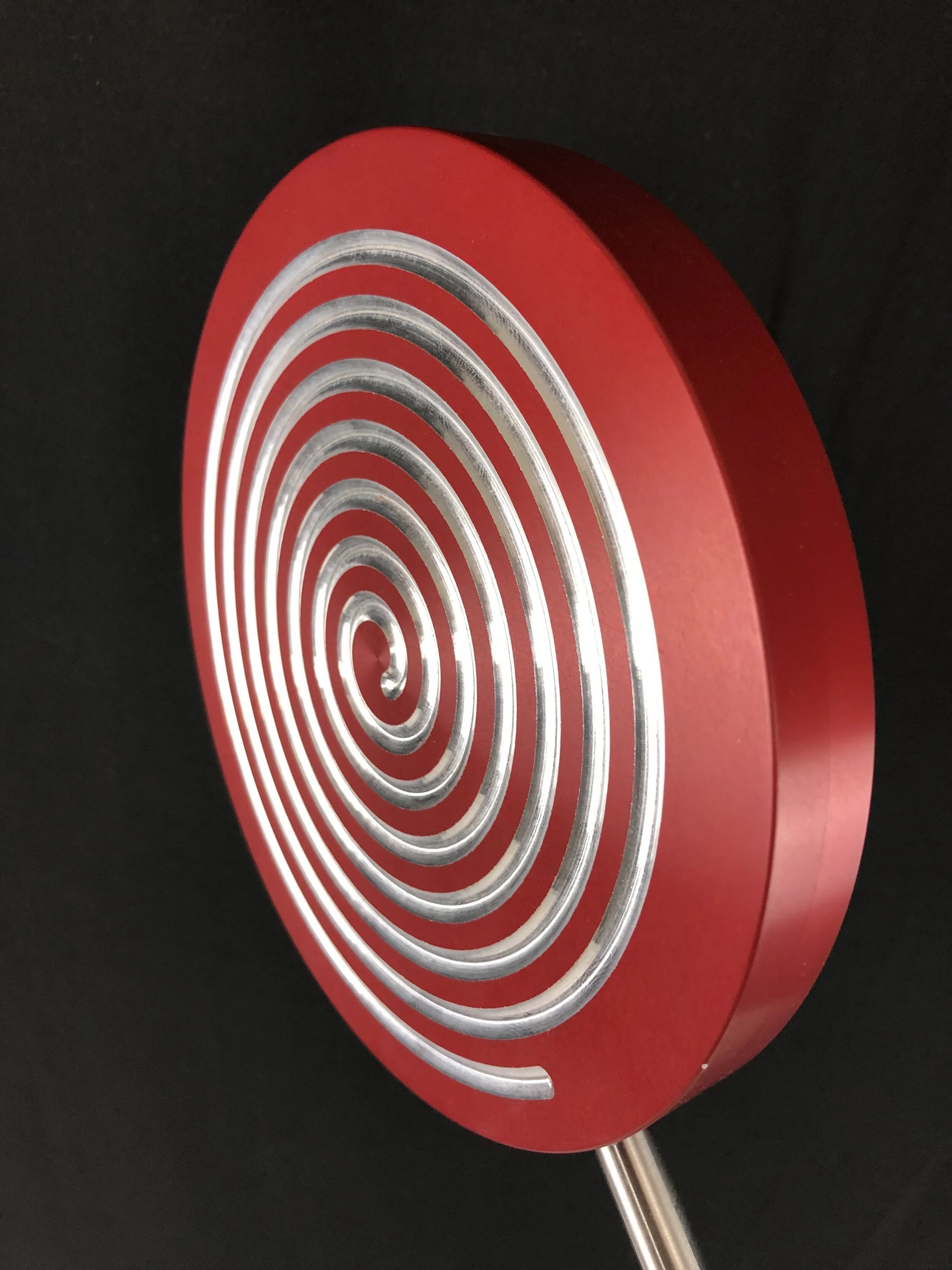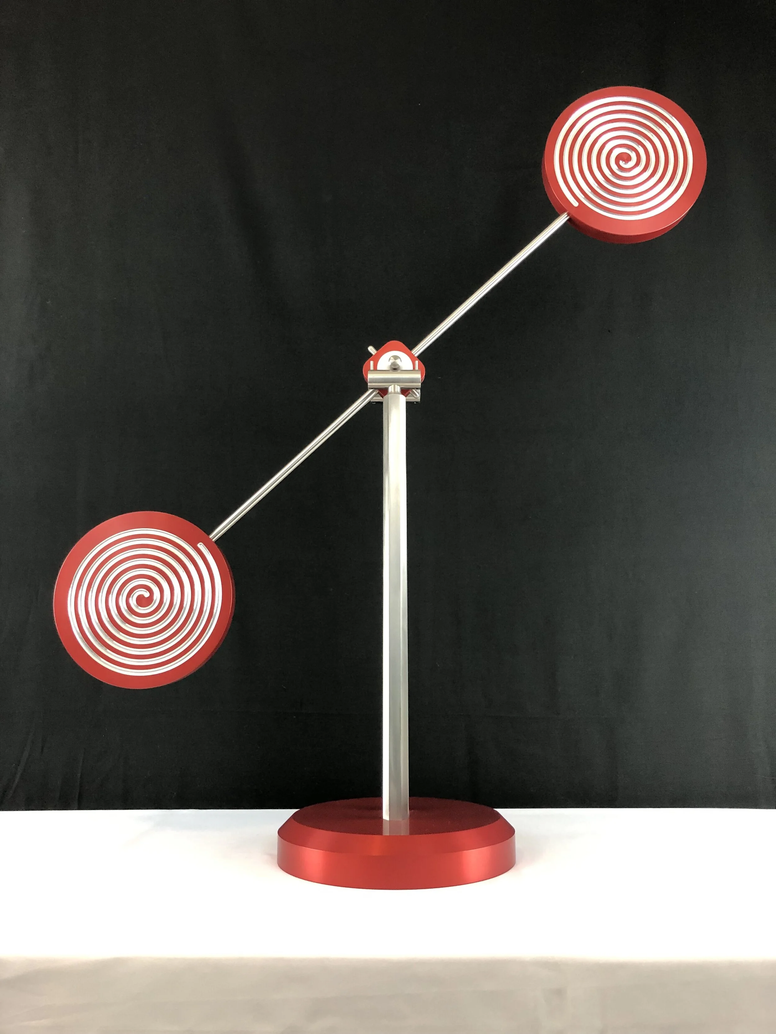 Swirl I is delightfully playful, with base and arms of red anodized 6061 aluminum and 304 stainless steel, reminiscent of childhood lollipops.