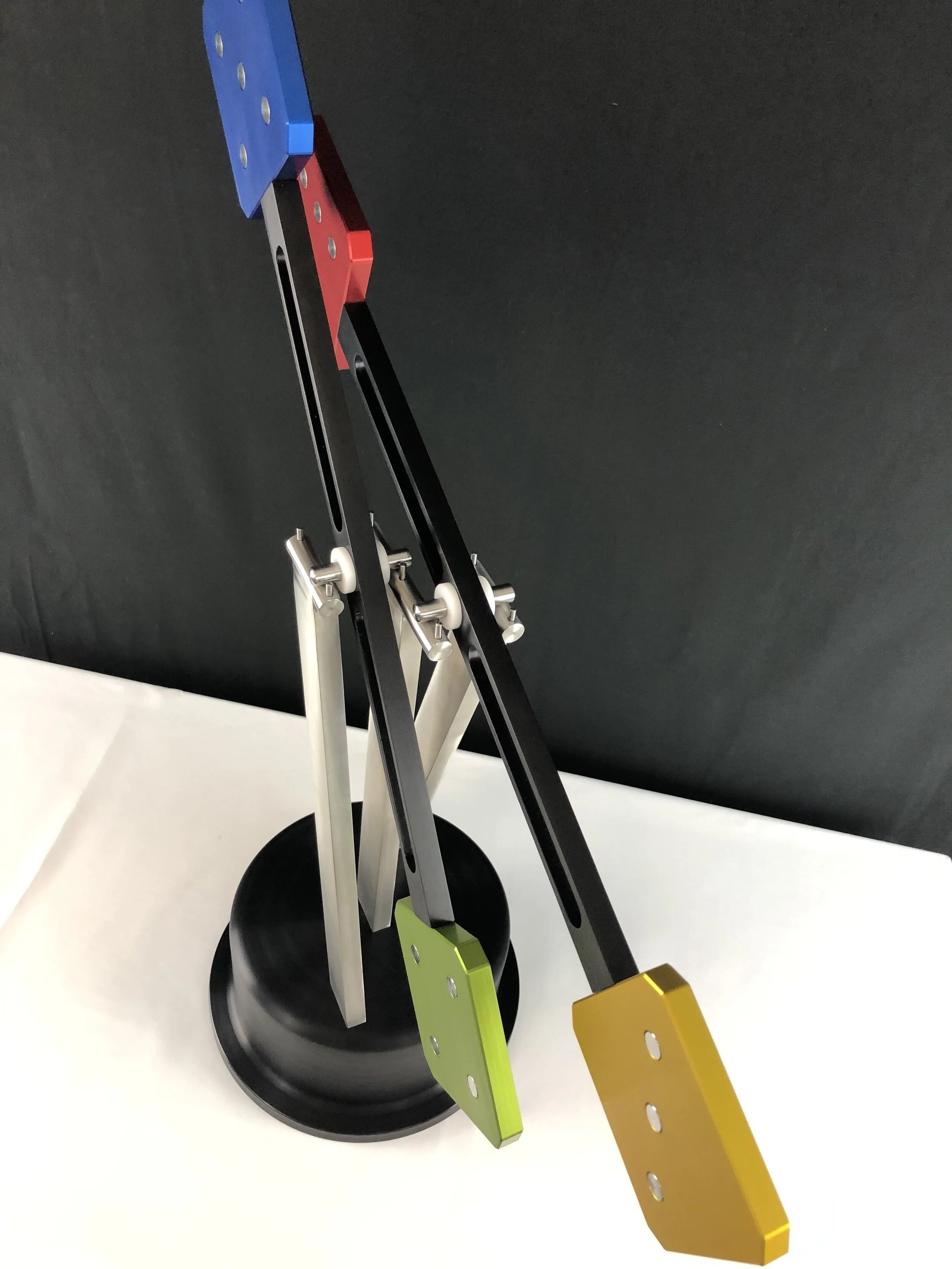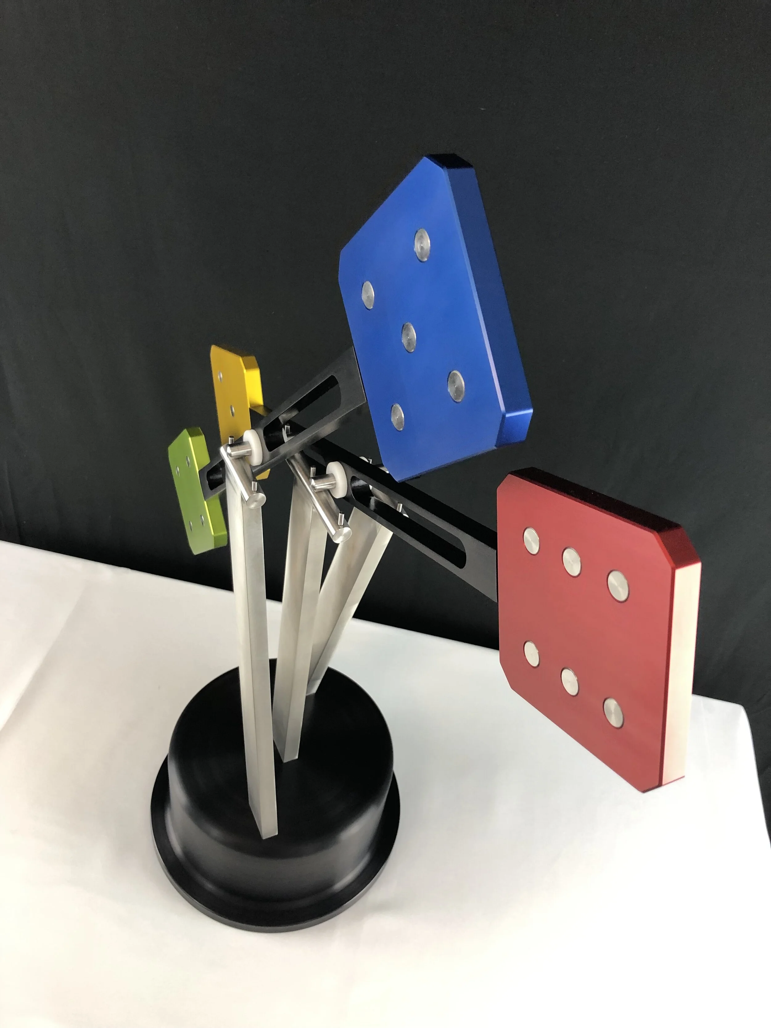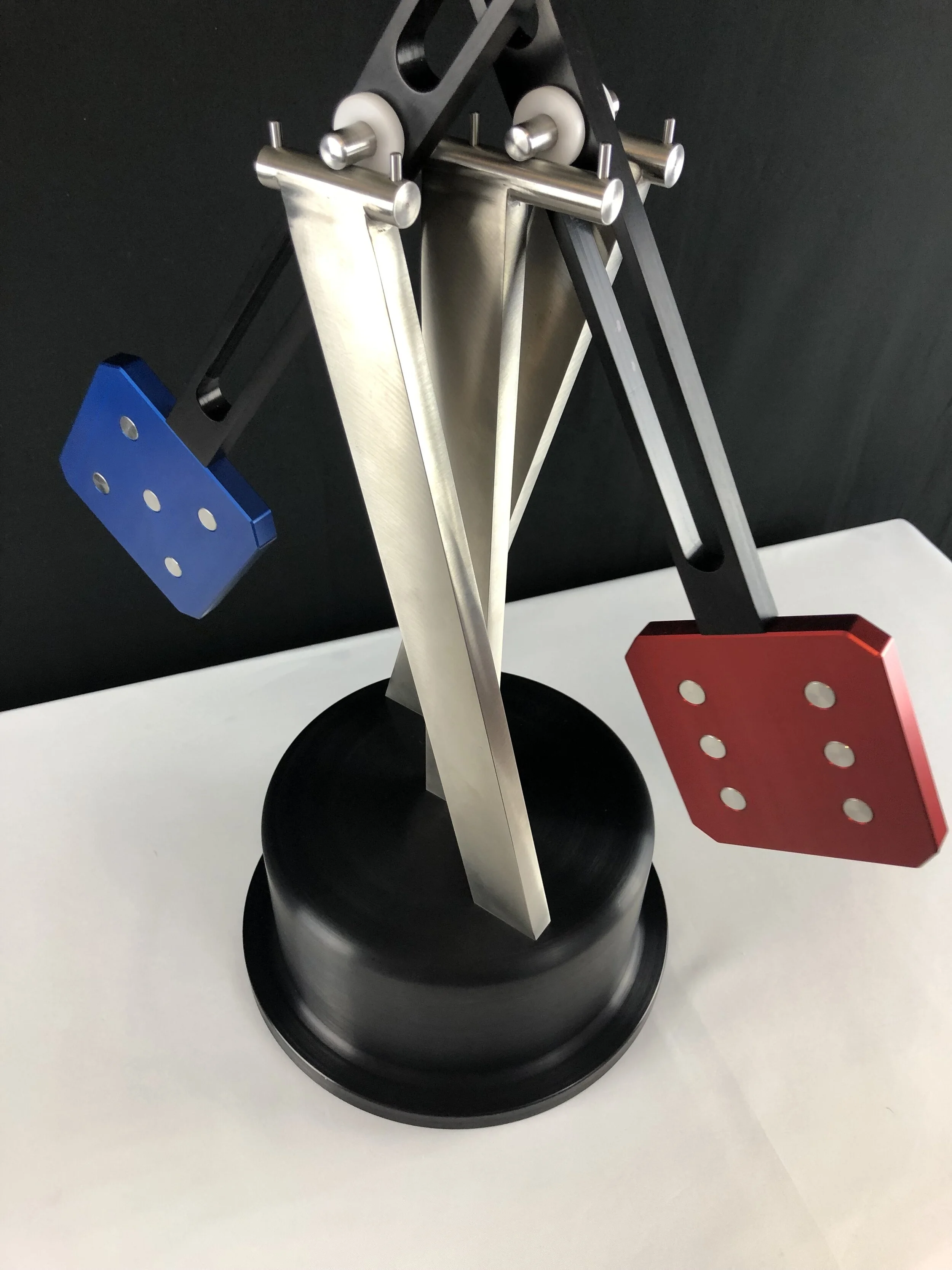 Fun and playful, Two The Nines has a 6061 aluminum black anodized base with 304 stainless steel uprights. And 6061 aluminum black anodized arms ending in fanciful dice of anodized blue, red, gold and green with 304 stainless steel inserts.